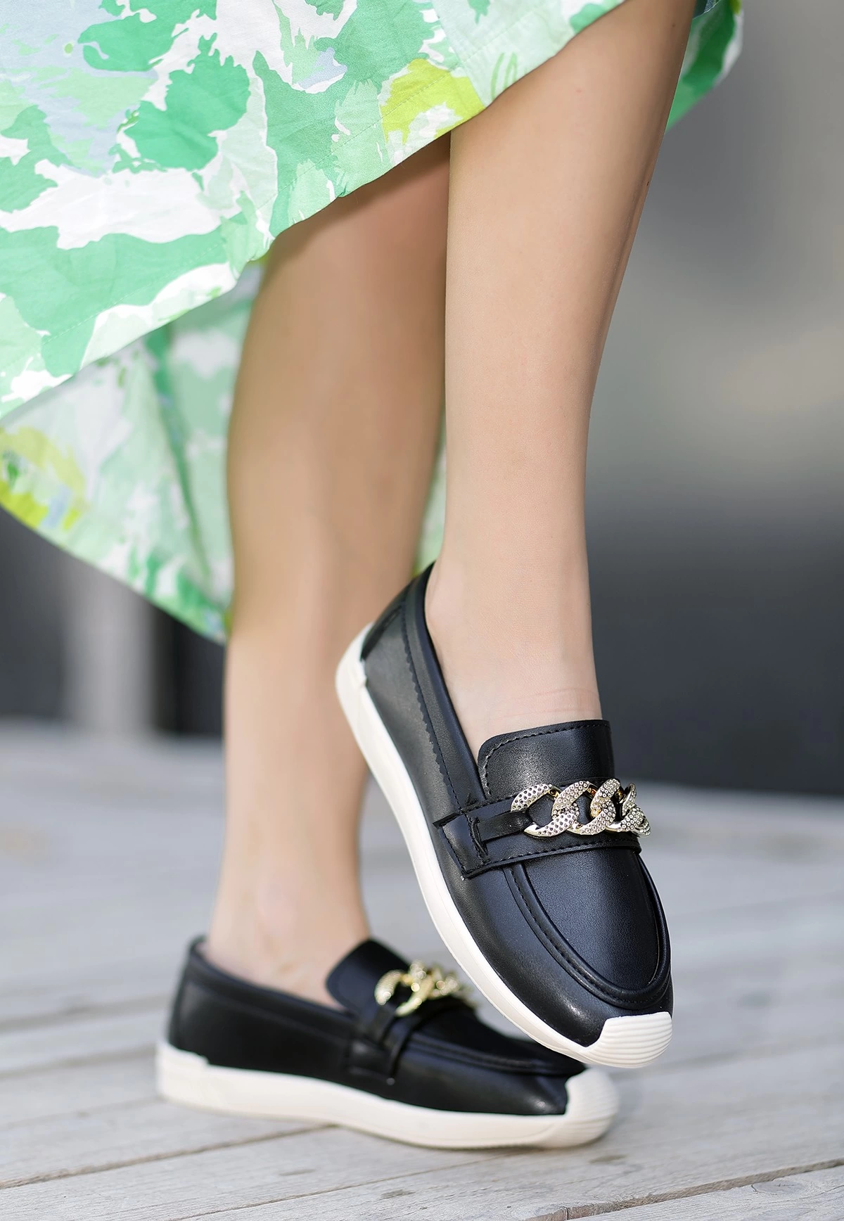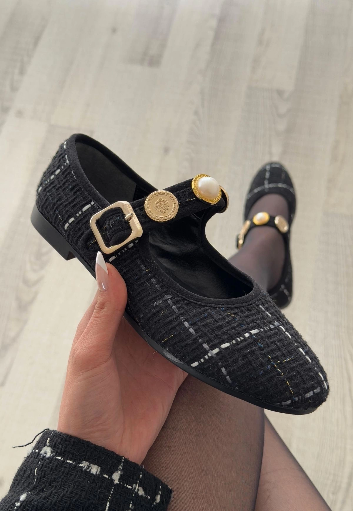 Hante Siyah Beyaz Keten Taşlı Babet Ayakkabı -