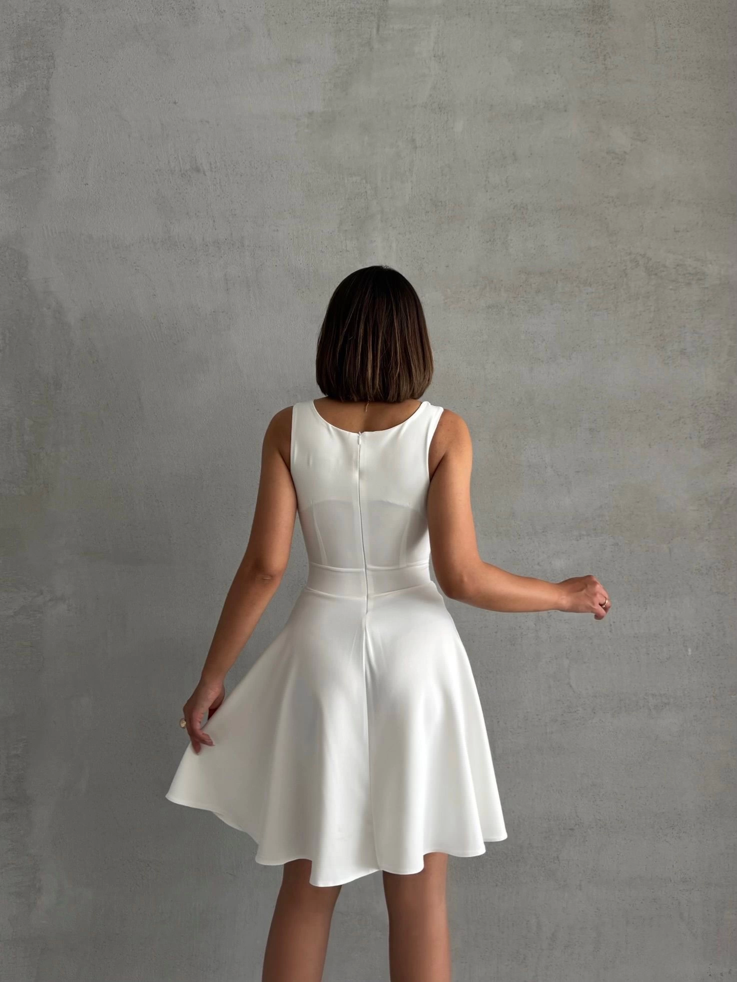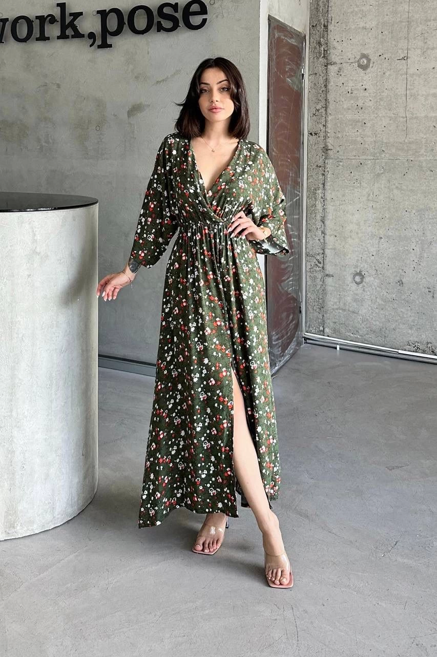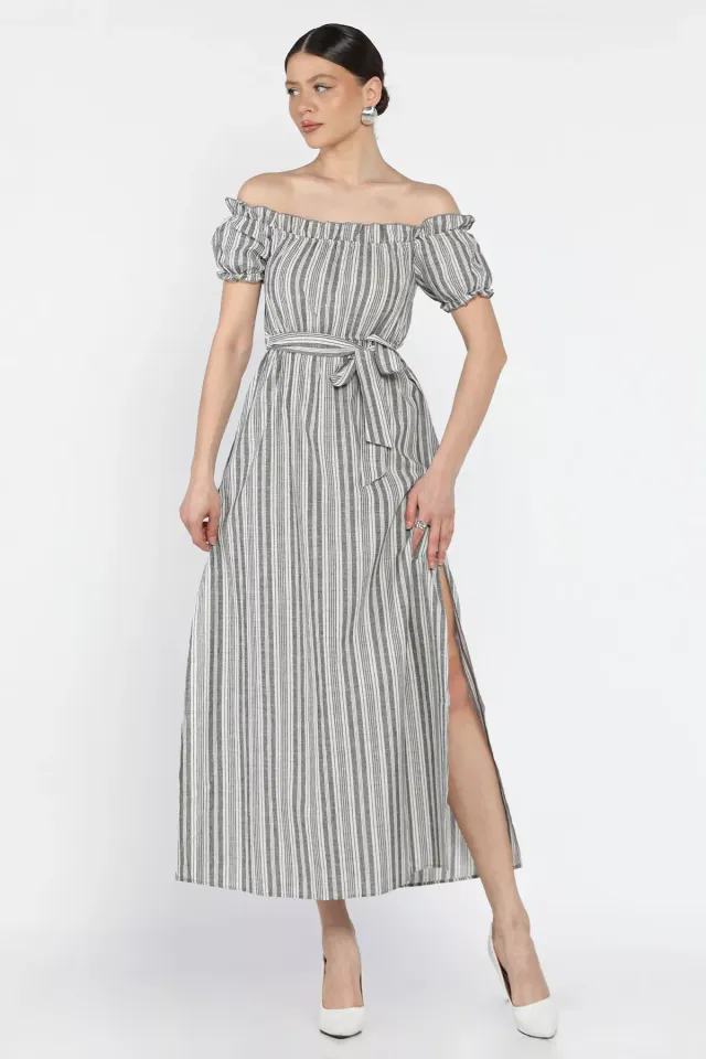 Madonna yaka midi yırtmaçlı kuşaklı keten elbise -