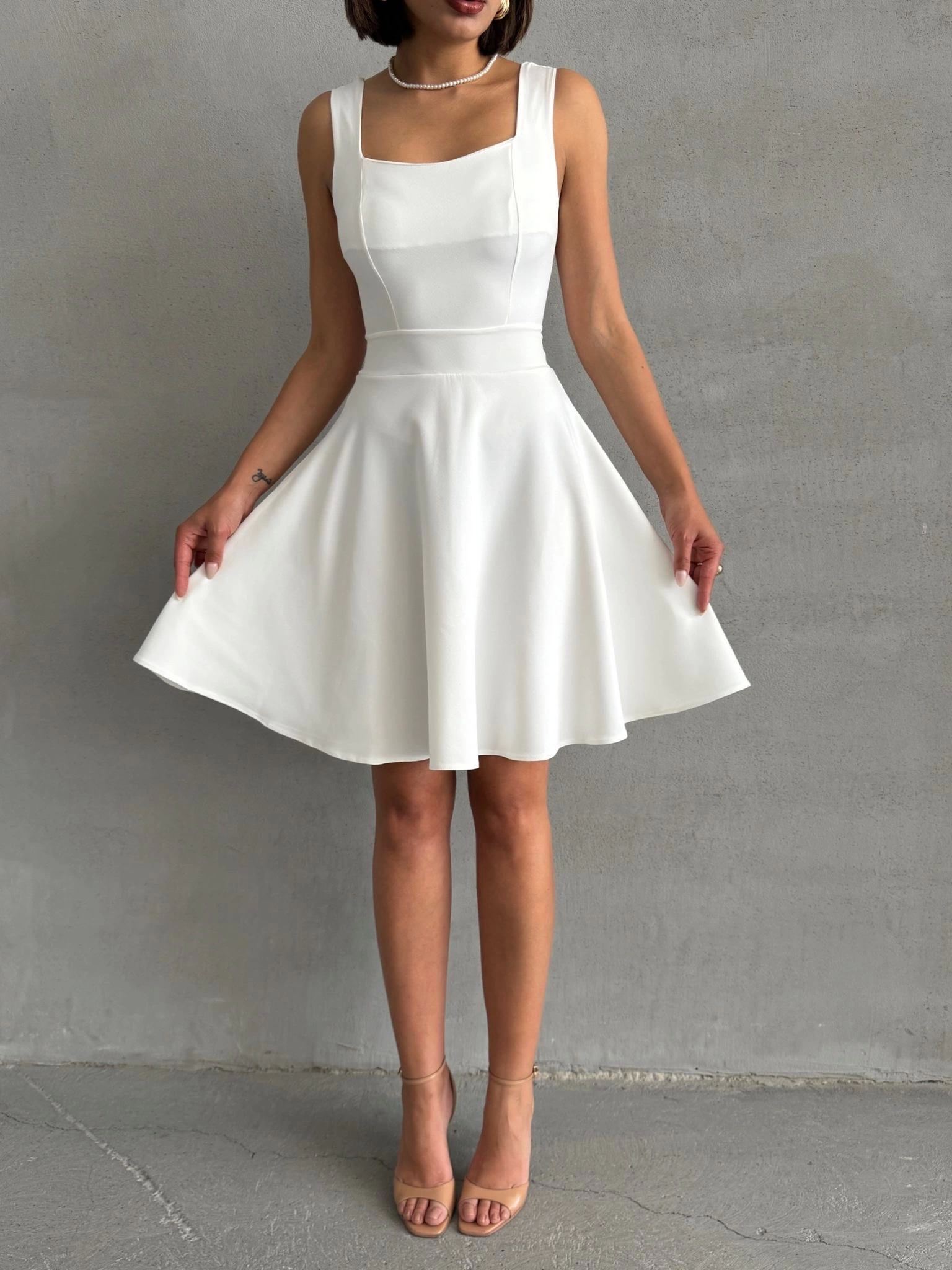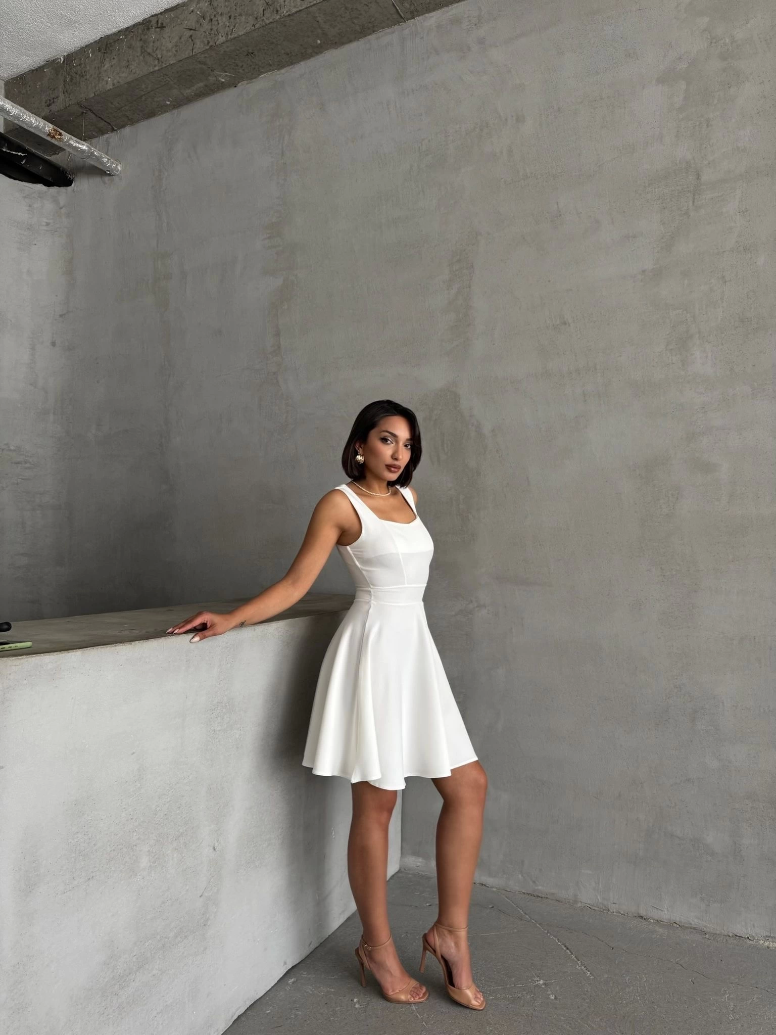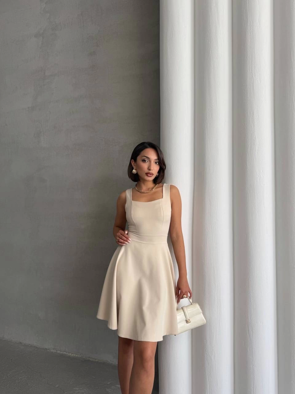 Madonna yaka midi yırtmaçlı kuşaklı keten elbise -