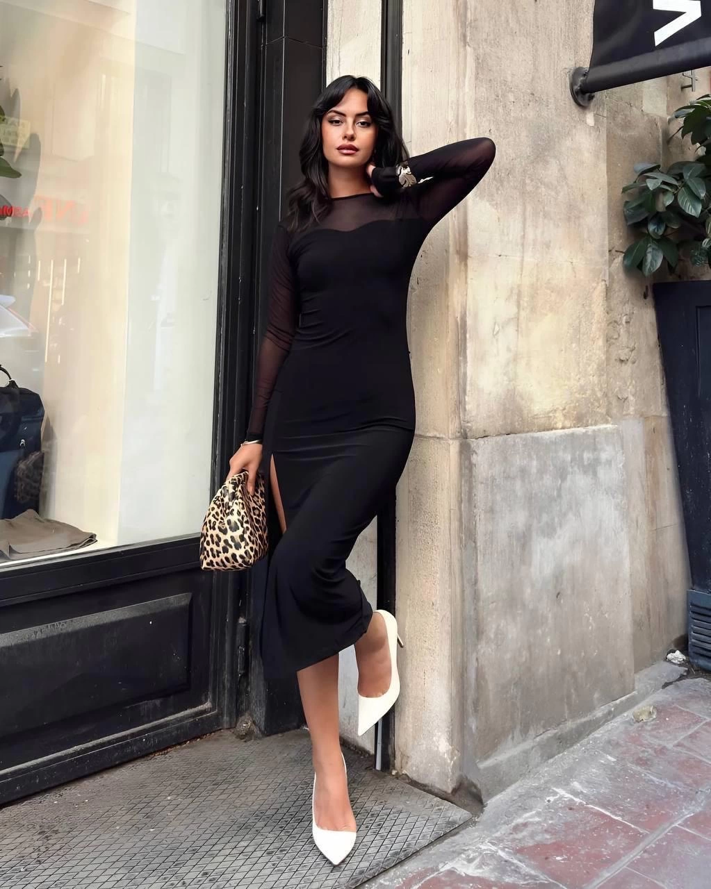 Kadın tül detaylı midi boy yırtmaçlı elbise -